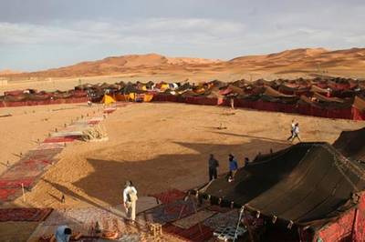 Neben der Hamada, inmitten der Sahara, am Fuße der Karavanenstraßen die zur Oase führen. Genießen Sie die Ruhe und den Frieden während des Kamelritts zu den Dünen um den Sonnenuntergang zu beobachten, die nächtliche Ankunft im Zeltlager, den Gang über die Teppiche zum Zelt, die leckeren Abendessen mit Harira und Mechoui am großen Feuer...