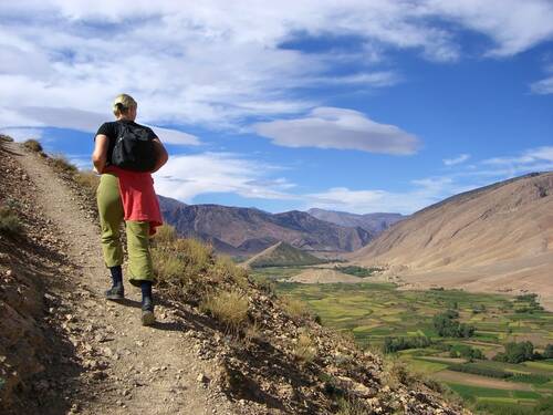 Riad Jnane Imlil is an authentic, family-run guesthouse located in the village of Imlil in the foothills of the Mount Toubkal High Atlas Mountains. It is only 67km south of Marrakech & the airport. We offer 9 rooms, all with private bathrooms, including 4 suites with balconies and 3 deluxe suites with sitting areas. All rooms and common areas are in a Berber design style with Tadelakt plaster walls, decorative tile, and furniture and architectural details hand-crafted and painted by local craftsmen. There are 3 comfortable salons & 2 panoramic roof terraces with stunning views of the Berber villages & Atlas Mountains, including a postcard perfect view of Toubkal summit, the highest peak in North Africa (4167m).